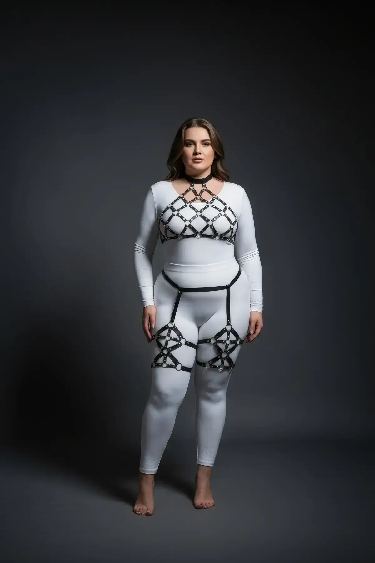 Designed specifically to celebrate the full figure, this Full Body Harness Set ensures a comfortable and customizable fit for all curvy body types. The entire garment is secured by numerous strong, fully Adjustable Straps across the shoulders, bust, waist, and hips, allowing you to tailor the set to your exact measurements. This durable PU Leather accessory set provides an empowering foundation for any outfit or intimate wear ensemble.