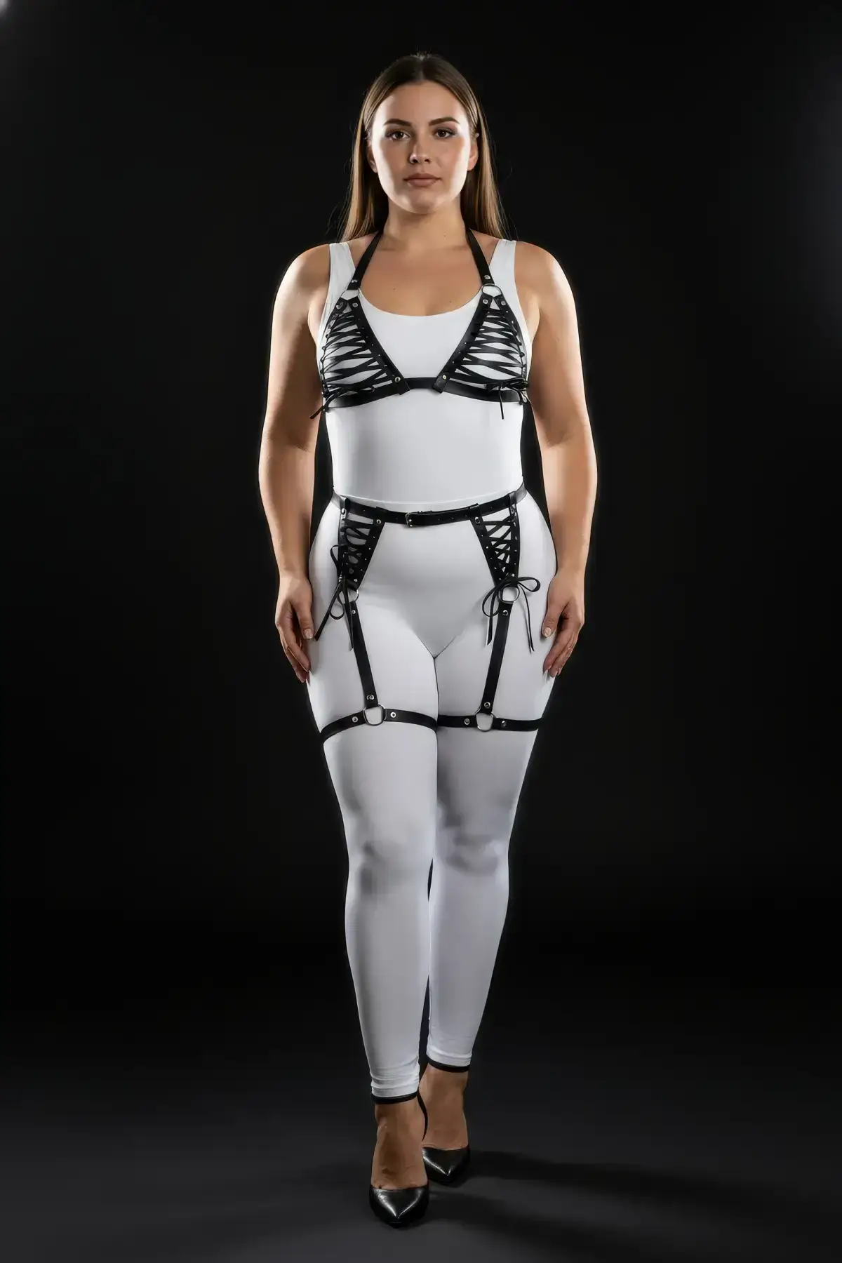 This premium Plus Size Black Women’s Leather Harness Set is crafted with adjustable straps at the shoulders, waist, and thighs to ensure a custom, comfortable fit that adapts seamlessly to your body. Forget one-size-fits-all frustration; this set provides genuine plus size support and style. The functional lace-up panels are not just decorative; they allow for fine-tuned shaping, enhancing your natural curves. The metal hardware and robust construction demonstrate superior craftsmanship, making this an essential addition to your body harness collection.