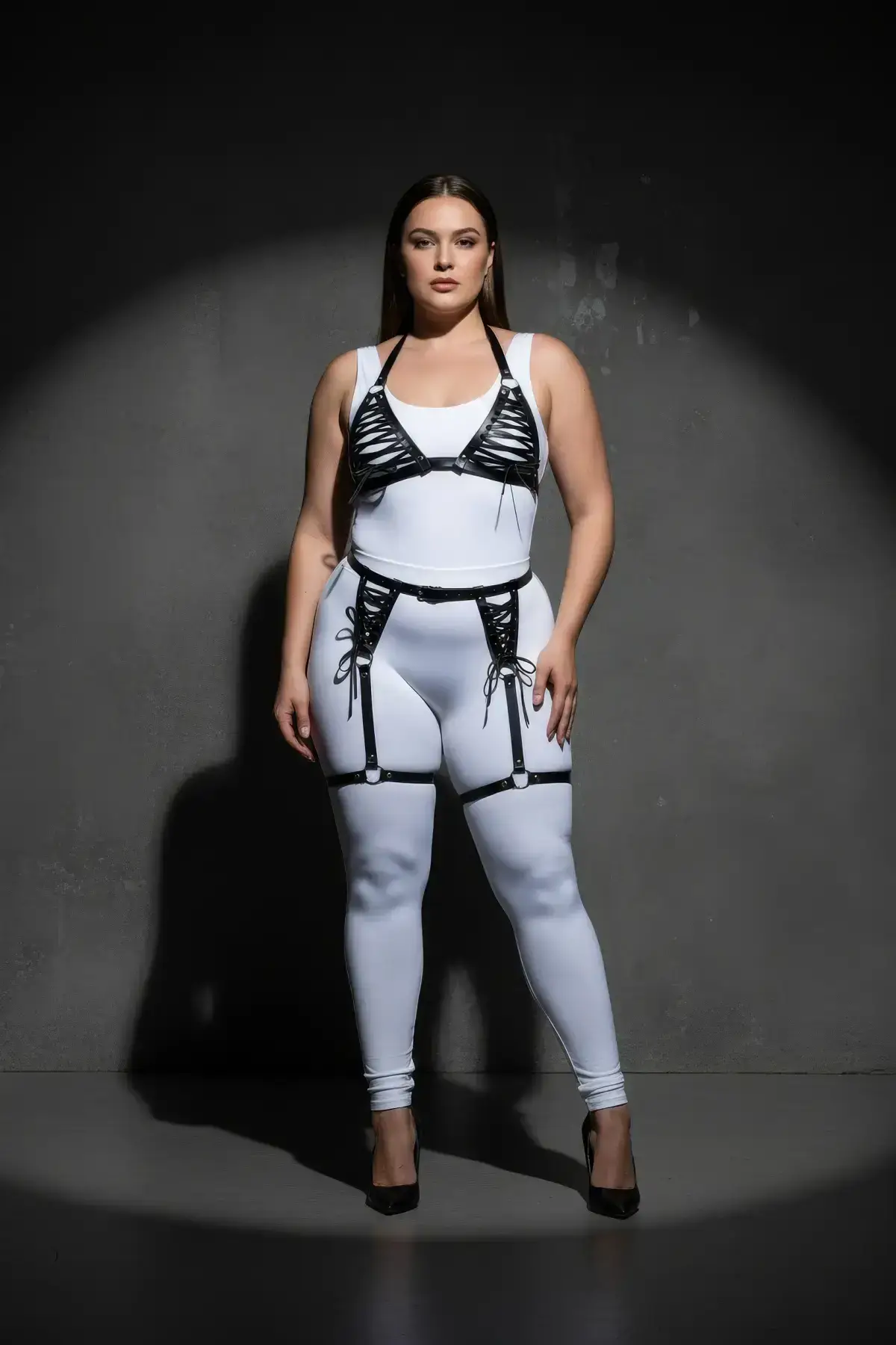 Unveil your confidence with the SH1389 Plus Size Black Women’s Leather Harness Set. This stunning, provocative combination is designed to celebrate every curve, featuring smooth, high-quality faux leather material in an intense black finish. The design includes a full torso body harness with intricate detailing and matching garter straps, creating a unified, powerful silhouette perfect for pairing with your favorite sensual lingerie or worn as striking outerwear. The visual centerpiece is the strategic lace-up detailing, adding a touch of fantasy to this luxurious set.
