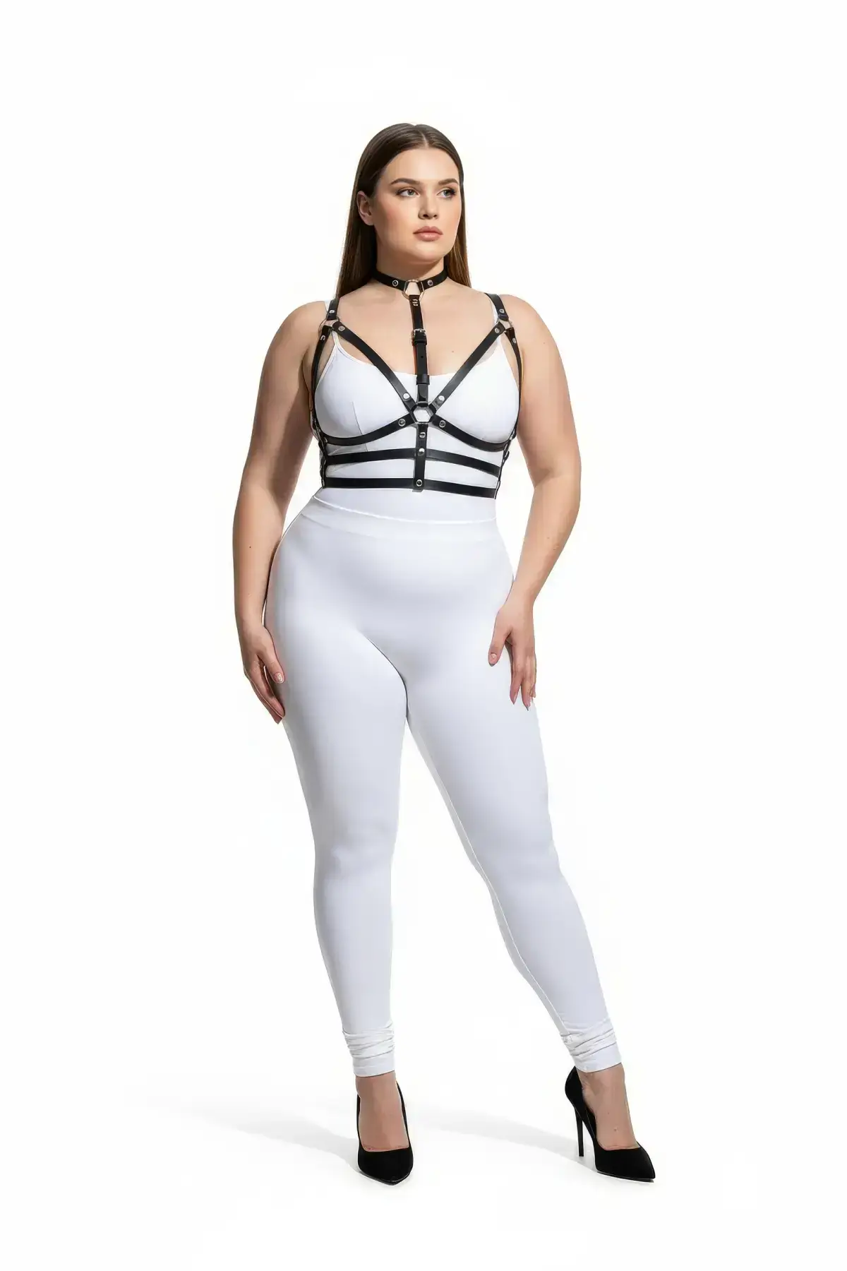 Introducing the ultimate Plus Size Black Women’s Leather Harness Set, meticulously crafted to be a show-stopping full body accessory. This design features smooth, durable adjustable faux leather with a sleek matte finish, perfectly complemented by premium silver-tone hardware, including sturdy buckles and a striking central O-ring visible at the chest. The integrated choker-style neck strap and ring detail enhance the powerful, structured aesthetic, instantly transforming any outfit into a dynamic statement piece. Specifically engineered with a curve-hugging design for curvier figures, this harness celebrates and supports your natural shape.