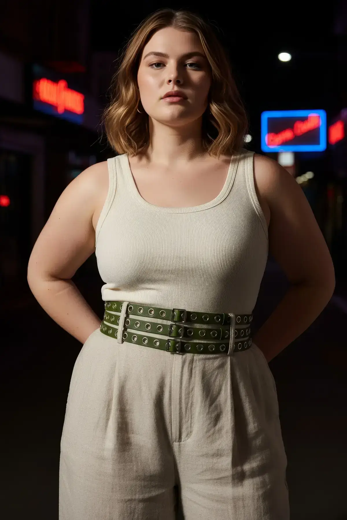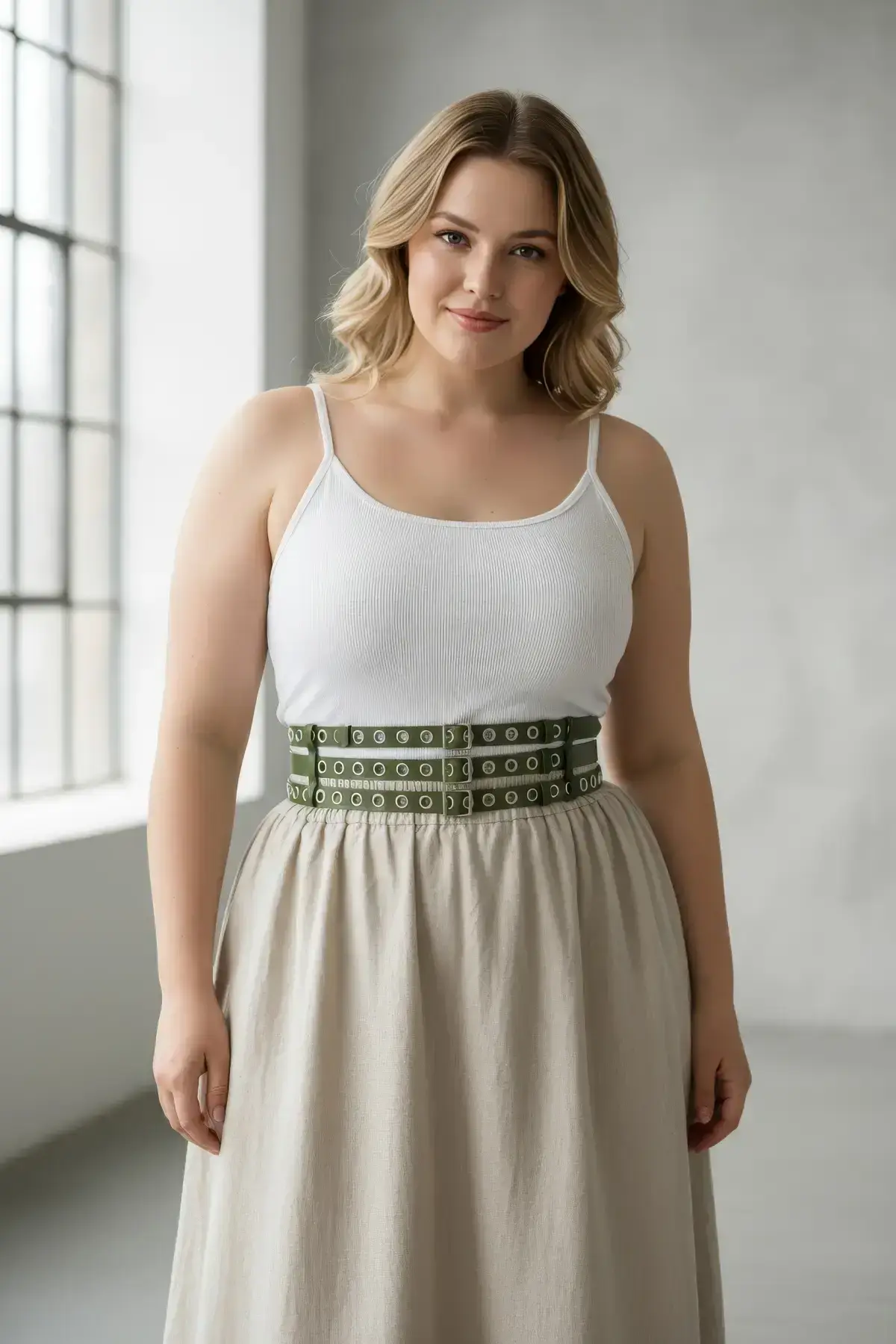 Pair this thick khaki belt with your favorite maxi dress to give it structure, or use it to complete a high-impact look over a sleek Leather Skirt and a simple top. Its neutral but bold color makes it incredibly versatile, working seamlessly with both muted and vibrant wardrobes. Cinch it up and instantly transform your silhouette with minimal effort.