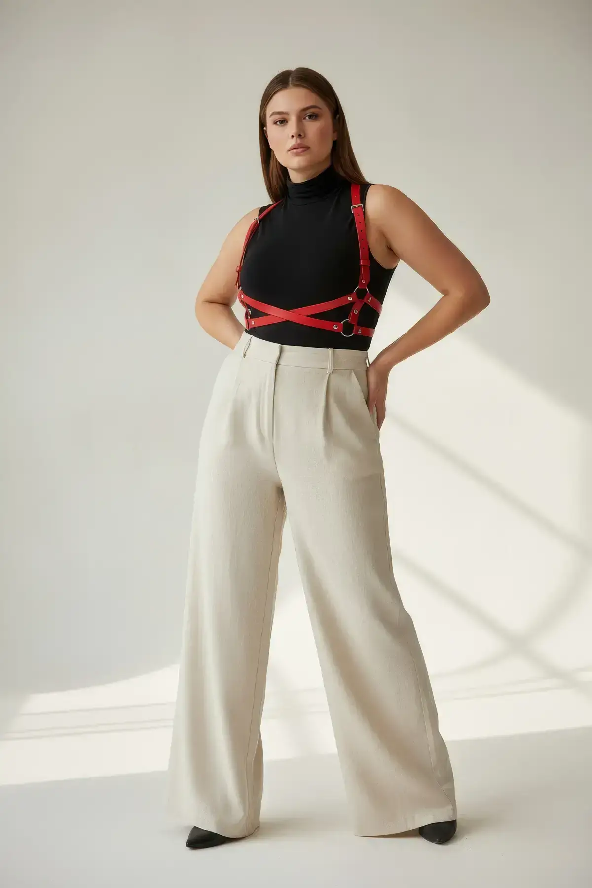 Our gorgeous Body Harness is created from high-grade, cruelty-free vegan leather that provides a luxurious, smooth feel against your skin. Every strap is engineered to contour your figure flawlessly, offering comfortable, body-hugging support. The fully adjustable straps and durable metal hardware guarantee a perfect, secure fit for all body shapes and sizes. Elevate your wardrobe with a piece that is as comfortable as it is commanding.