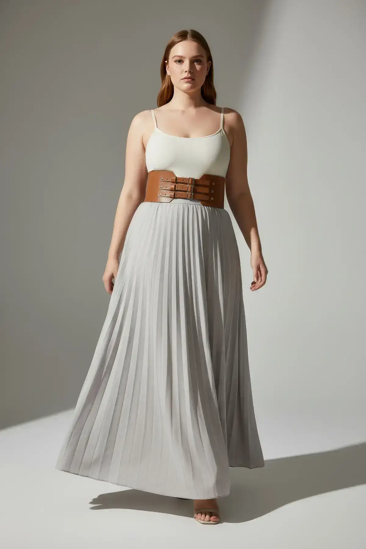 Designed specifically for a curvy body, this belt features a wide elastic back for flexibility and three striking front buckles that add an edgy, modern touch. It’s more than just an accessory; it’s a statement piece, elevating casual wear, dresses, or even a simple blouse. Pair it with a Leather Skirt for a show-stopping ensemble that truly reflects your bold style.