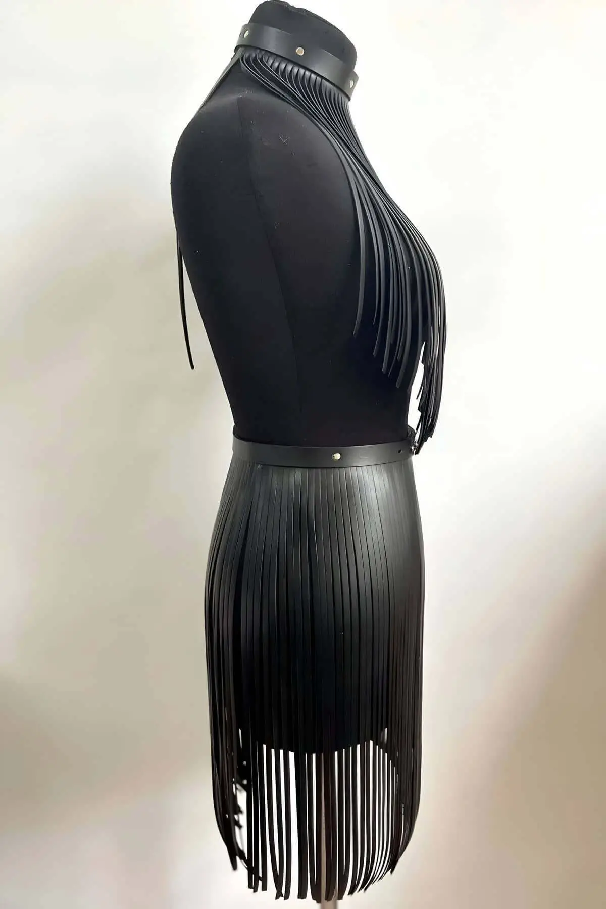 This Tasseled Skirt Set is crafted to turn heads, blending the allure of bondage-inspired styling with contemporary clubwear aesthetics. The bustier offers support and structure, while the long, faux leather skirt provides coverage contrasted by its seductive high-slit detail. Unlike a standard Leather Skirt, this two-piece design allows for versatile styling. Wear the pieces together for a full, cohesive look, or mix them with other items in your wardrobe, pairing the bustier with high-waisted trousers or the skirt with a simple crop top.