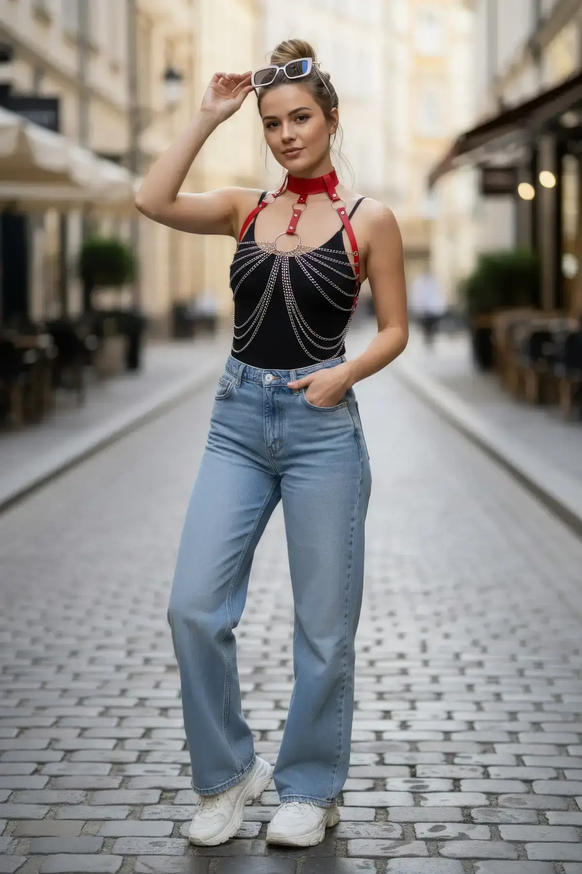 The bold red hue makes this belt an incredibly versatile piece for styling. Pair it with an all-black outfit to make the color truly pop, or layer it over contrasting patterns for an eclectic look. For a cohesive, head-to-toe statement, combine this fierce piece with a matching Choker to frame your face and tie the whole powerful ensemble together. Step out and let your accessories do the talking.