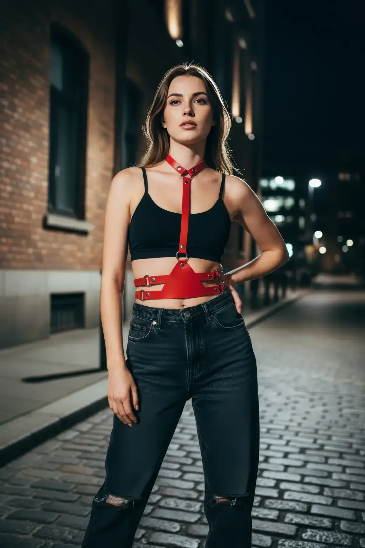 Make an unforgettable entrance with this striking red women’s leather belt. More than a simple waist accessory, this piece is an intricate body accessory featuring multiple adjustable buckles that transform any outfit into an edgy, statement-making ensemble. It’s the perfect way to add a dynamic splash of color and architectural detail, blurring the line between a traditional belt and a stylish Body Harness.