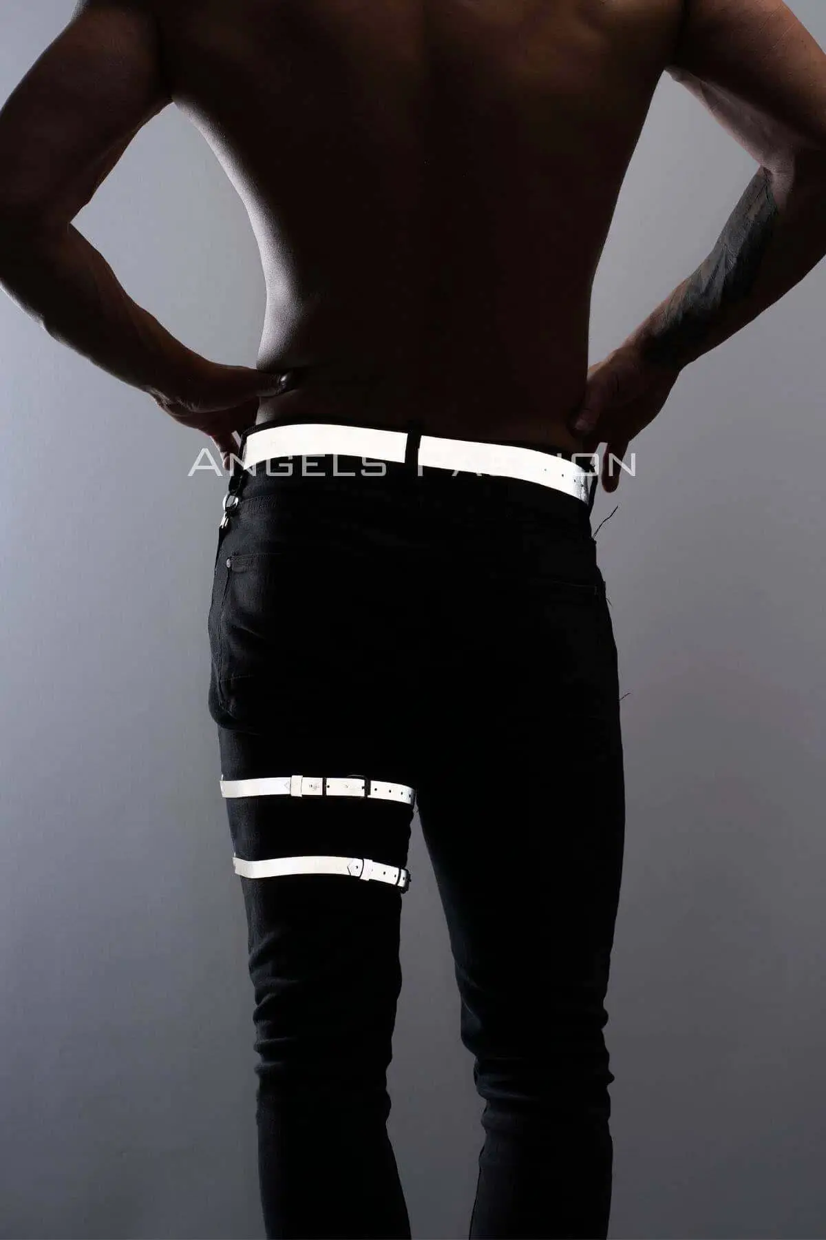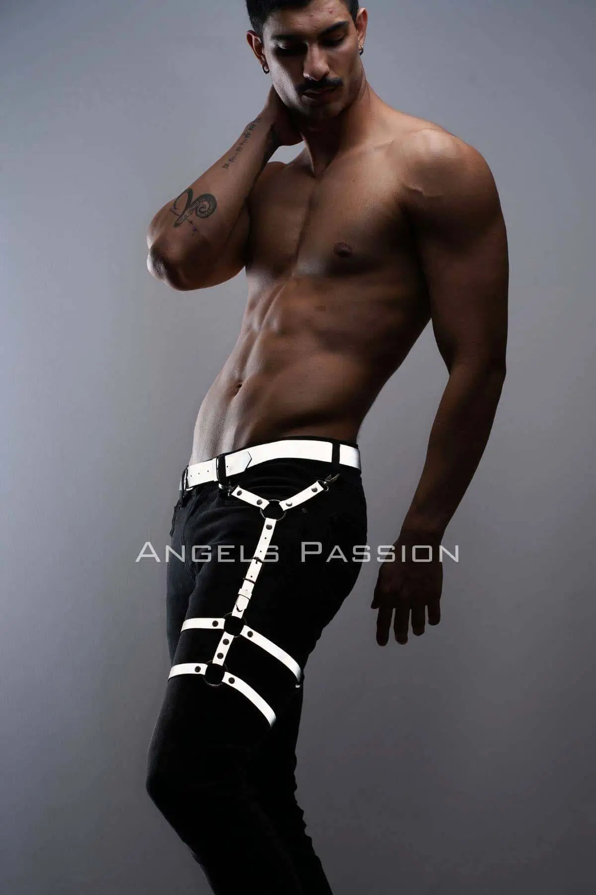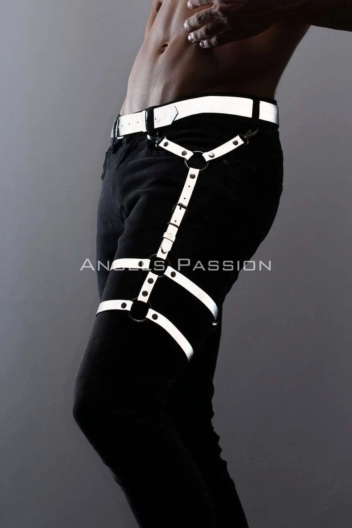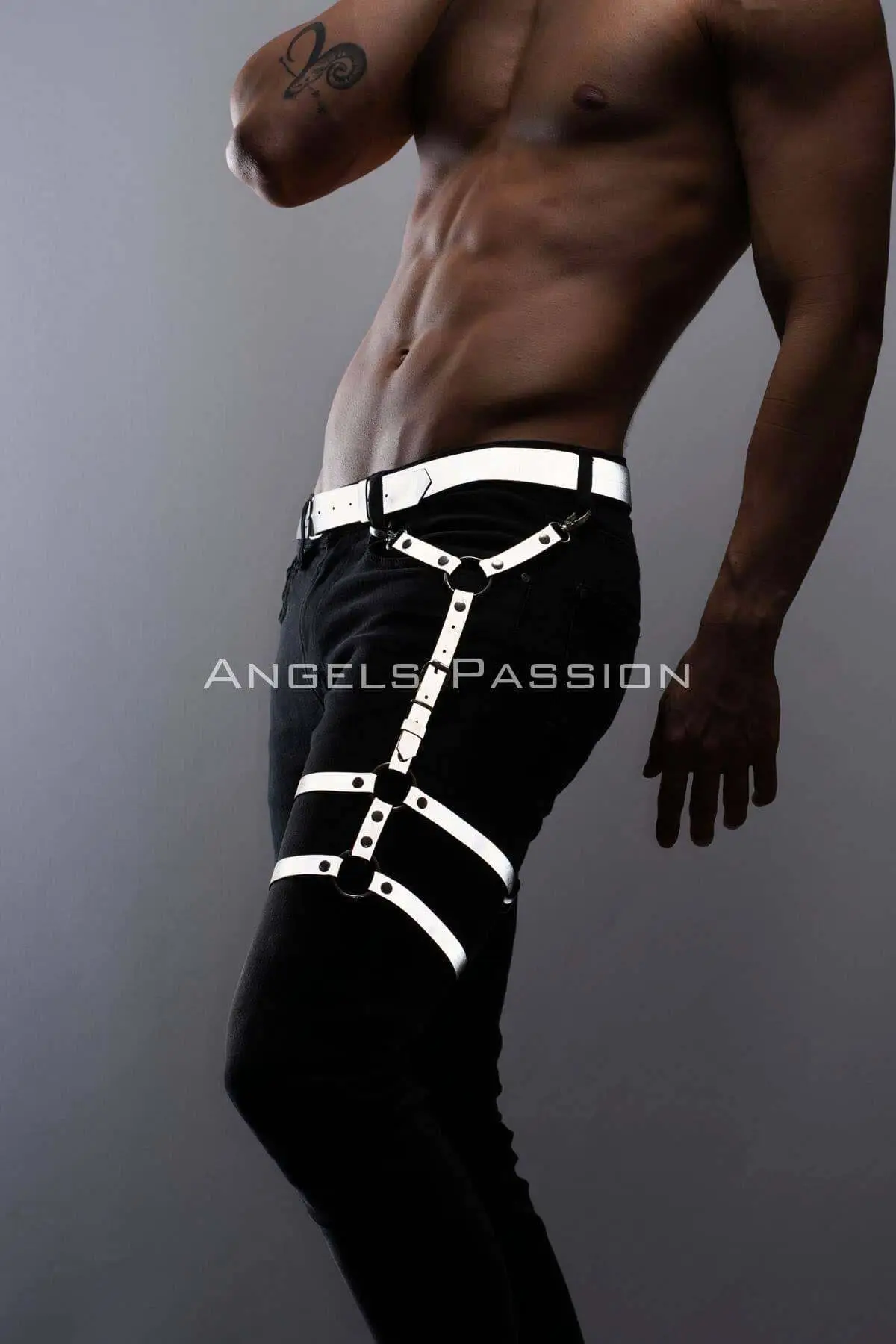 Crafted from high-grade, durable synthetic material, this **Reflective Men’s Leg Belt** is built for intense nights and bold statements. The material is expertly treated to be both intensely reflective under direct light and subtly **Glow-in-the-Dark**, ensuring maximum visibility and allure in any environment. Finished with robust, high-polish metal hardware, the craftsmanship speaks to a commitment to lasting quality and premium aesthetics in **Nightlife Fetishwear**.