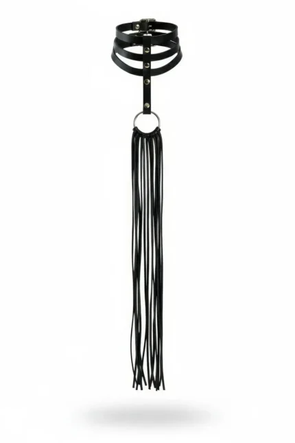 Siyah Deri Üç Bantlı Halka Detaylı Uzun Püsküllü Choker SH1021