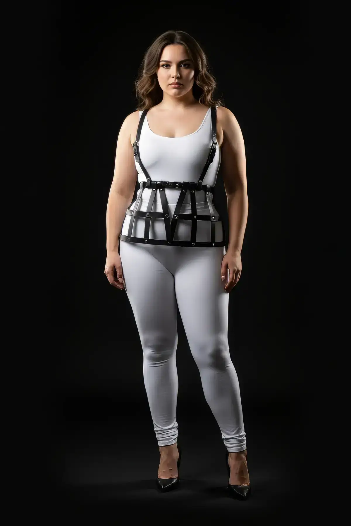 The ultimate combination of attitude and style, the Plus Size Black Leather Skirt with cage detail is designed to be your next essential statement piece. This bold set features a sleek, smooth black faux leather mini-skirt with a flattering high-waisted fit, perfectly tailored for the curvy figure. The true focal point is the detachable or paired harness accessory, showcasing an intricate caged strap design that wraps over the skirt to create a visually arresting look, exactly as seen in the image. It’s a versatile fashion element that blends the sleek texture of the skirt with the daring geometry of the straps.