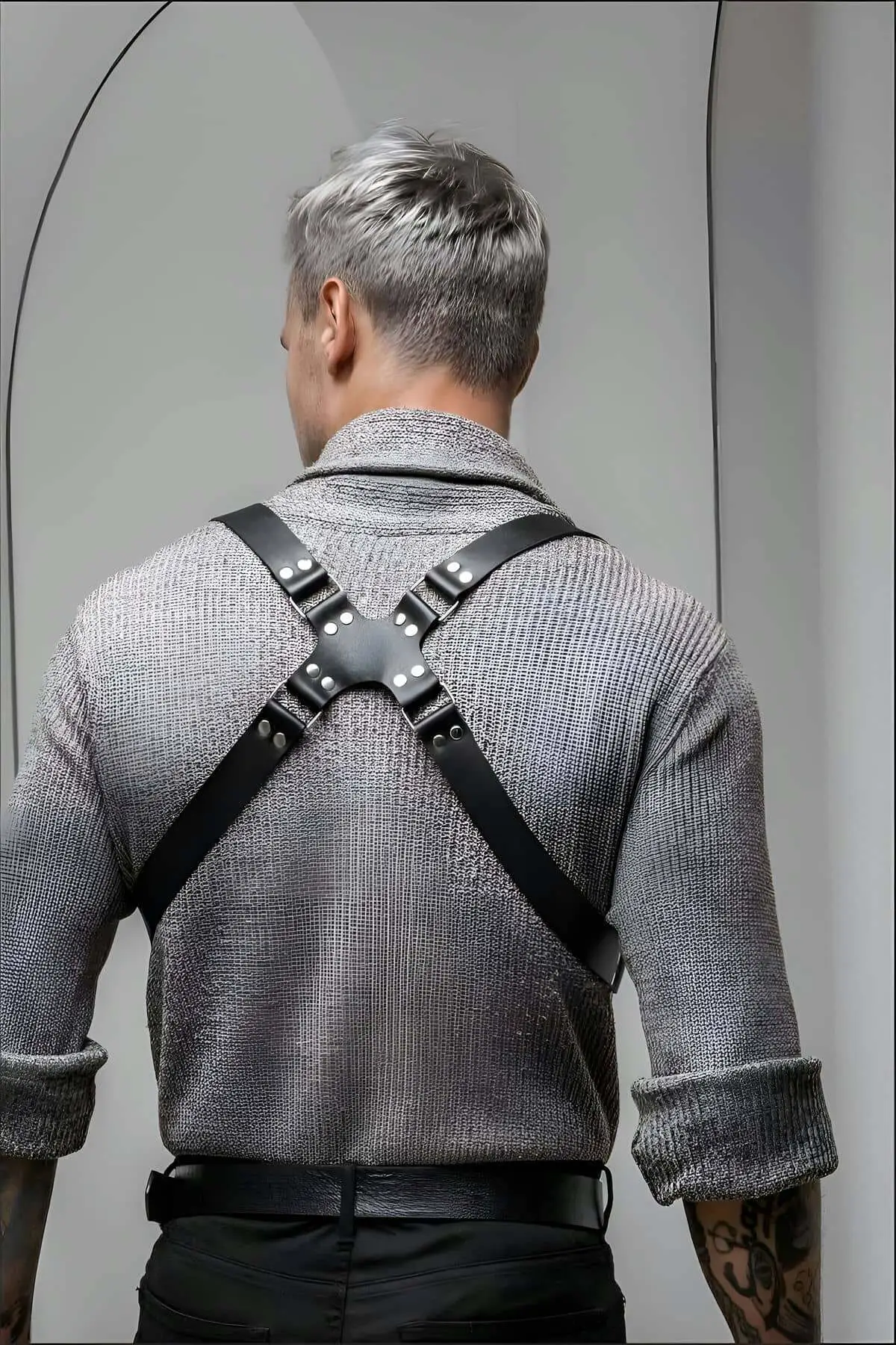 - Versatile Style: Easily worn over a t-shirt, shirt, or bare skin. The distinctive back detail allows for a subtle, yet commanding, presence in the club, bedroom, or a photoshoot.