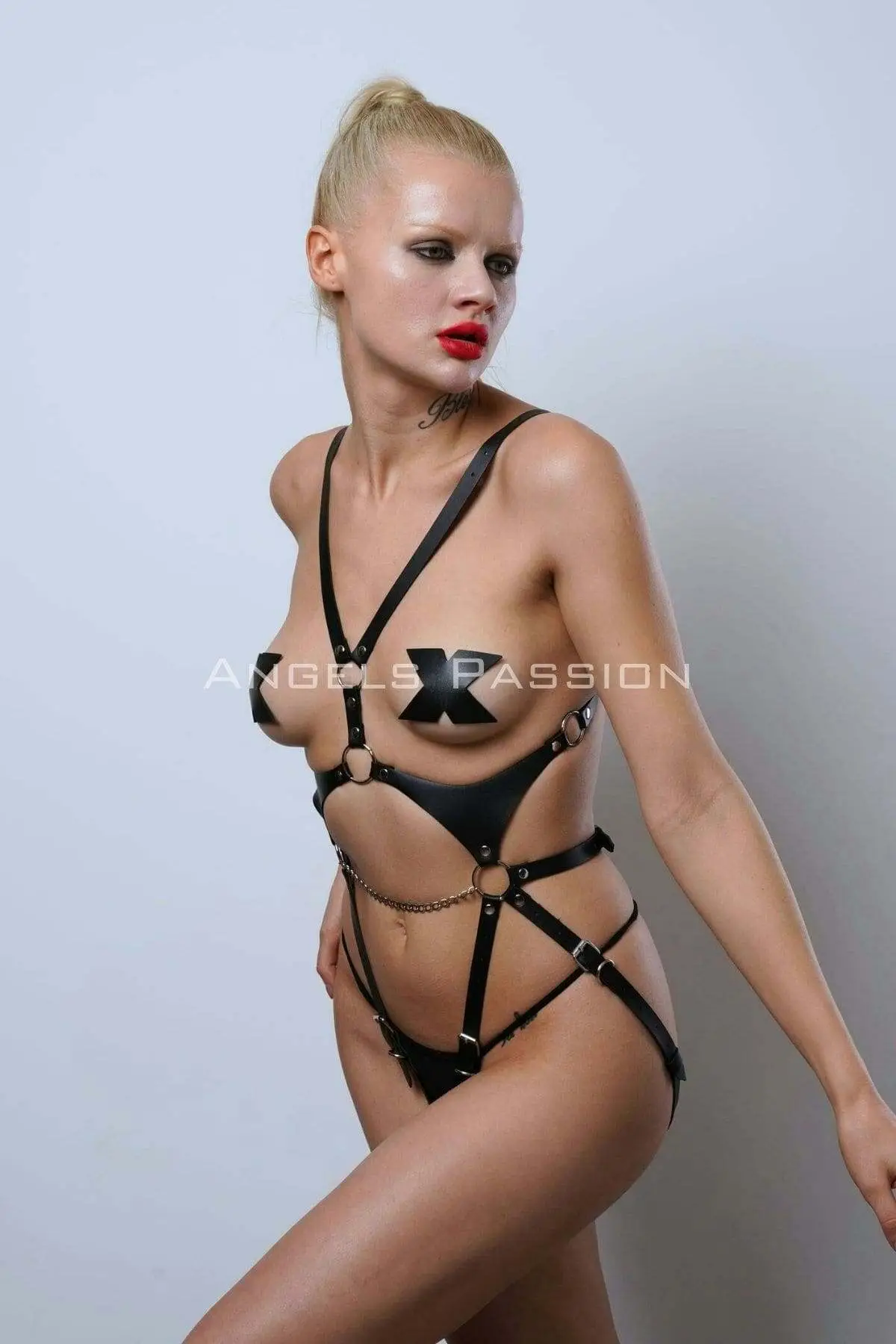 Elevate your ensemble with this versatile Open Crotch Leather Body Harness. Designed with both form and function in mind, the intricate strapwork is connected by strong metal O-rings, providing a caged structure that highlights your natural curves. It’s the ultimate statement piece for festivals, photoshoots, or as daring Body Harness wear. The combination of black faux leather and gleaming silver hardware ensures a luxurious, high-contrast look that is instantly memorable.