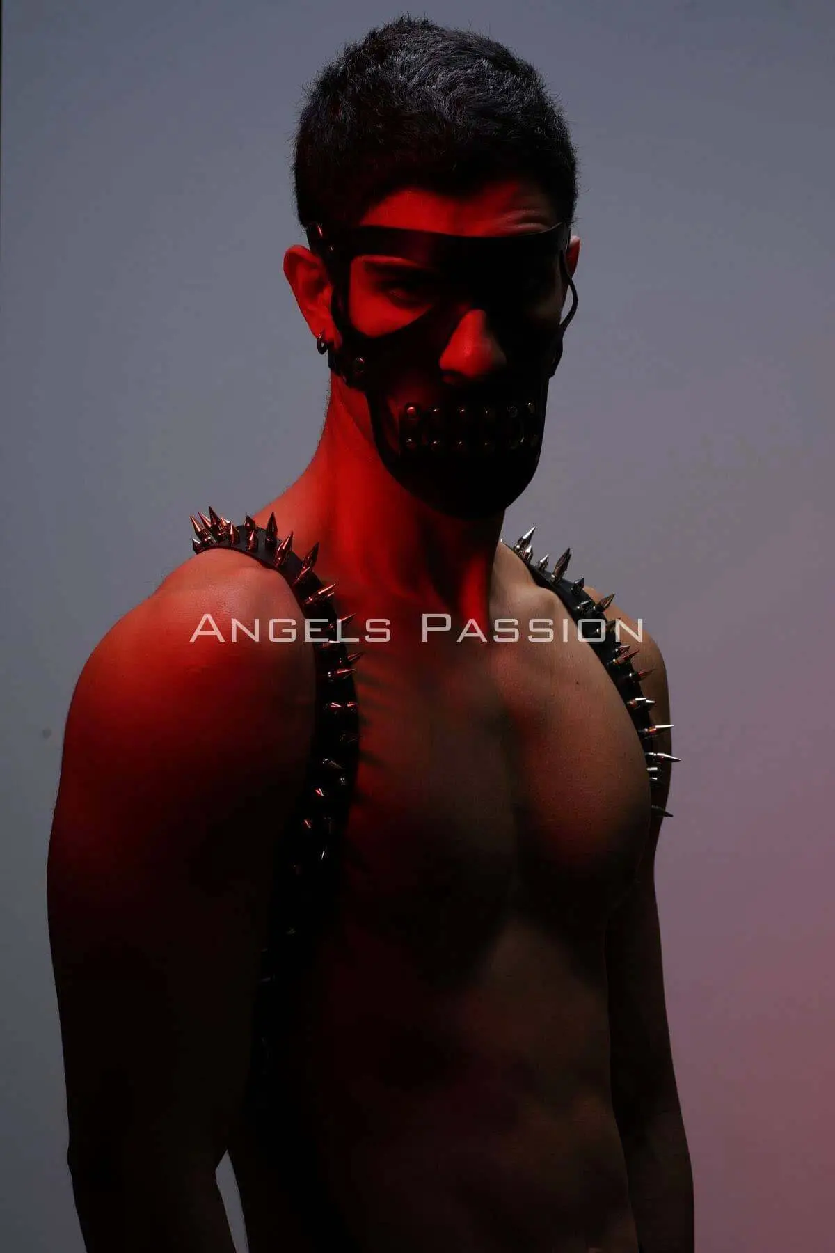 The harness and matching mask are meticulously crafted from durable, high-grade vegan leather, selected for its luxurious feel and long-lasting resilience. Each strap is powerfully defined by polished, resilient metal studs, strategically placed to catch the light and emphasize the muscular contours of the chest and shoulders. This is not merely an accessory; it is a piece of wearable architecture designed for maximum visual impact and ultimate self-expression.