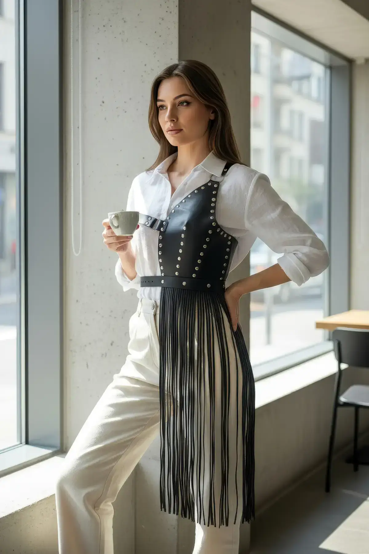 The versatility of this piece allows it to be the centerpiece of countless looks, from concert nights to high-fashion events. Pair the Black Skirt with Leather Studs with a sheer top and a dramatic Choker for maximum impact. Layering is effortless; consider adding a bold Body Harness over a simple top for a cohesive look. For a more subtle, yet powerful statement, match it with one of our designer Women’s Belt options. Embrace the dramatic flair of the asymmetrical cut and the constant movement of the fun, flowy tassels.