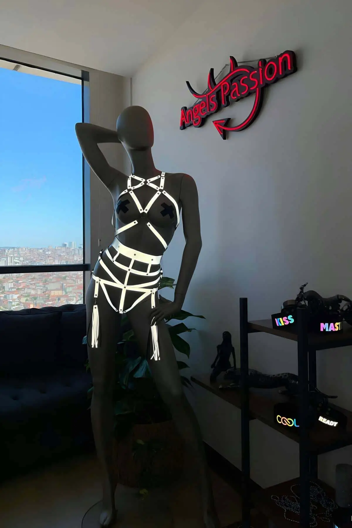 Achieve a powerful and stylized aesthetic instantly with the SH402, which functions as both a chest harness and a matching garter harness. The bold straps and metal hardware add a gritty edge, while the signature reflective tassels ensure you are always the focus of attention. The combination of static structure and dynamic fringe makes this outfit unparalleled for any setting that demands visibility and flair. For another multi-piece look that creates a dramatic silhouette, explore our Body Harness selection today.