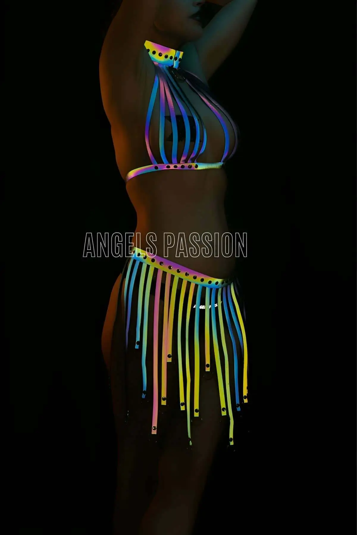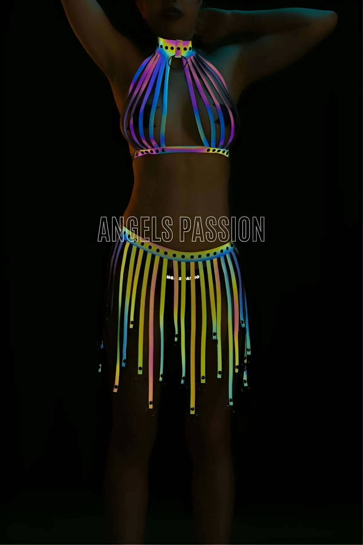Step into an ethereal realm with the Tasseled Colorful Reflective Fantasy Dress, a show-stopping piece of sexy harness lingerie designed to capture every gaze. This high-impact mini-dress is crafted from a comfortable, dark sheer mesh base that provides a flattering bodycon fit and features elegant long sleeves. The true magic lies in the dense covering of vertical strips, which are made from holographic material that explodes into a spectrum of colors—pinks, blues, and yellows—under direct light. Perfect as festival wear or a unique statement piece, this creation is a must-have for those who dare to be seen.