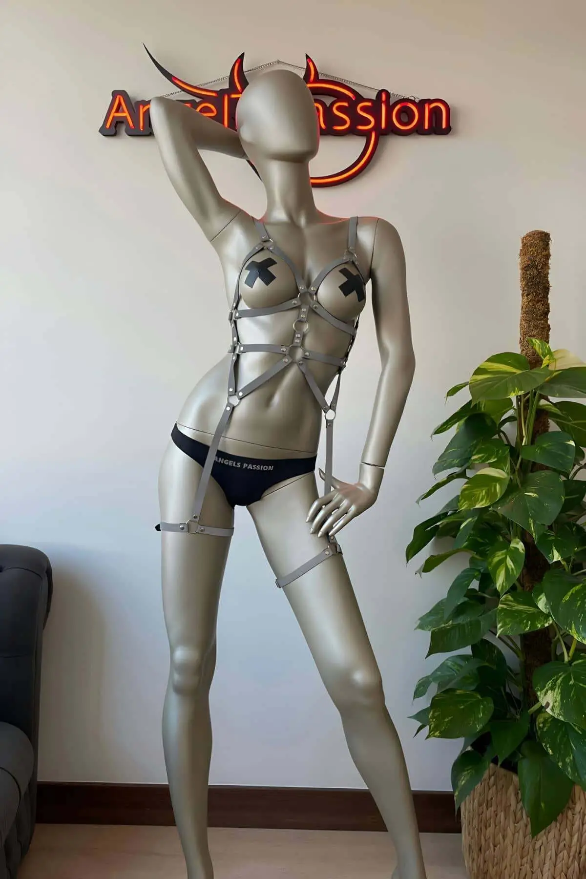 Step into the spotlight with the women’s lingerie dance costume reflective harness, a true showstopper designed to make you unforgettable. This unique piece features wide, silver-grey straps made from a premium high-visibility gear material that brilliantly catches and reflects light, instantly illuminating your silhouette. The design is a captivating combination of a Body Harness and a Garter Harness, creating a striking geometric pattern over your torso and thighs. Perfect as a memorable festival outfit or an exotic dance costume, the contrasting black hardware allows for full adjustability, ensuring a comfortable and secure fit whether you are performing or partying.